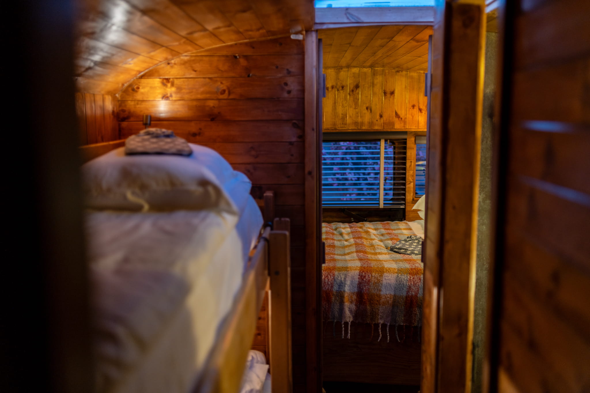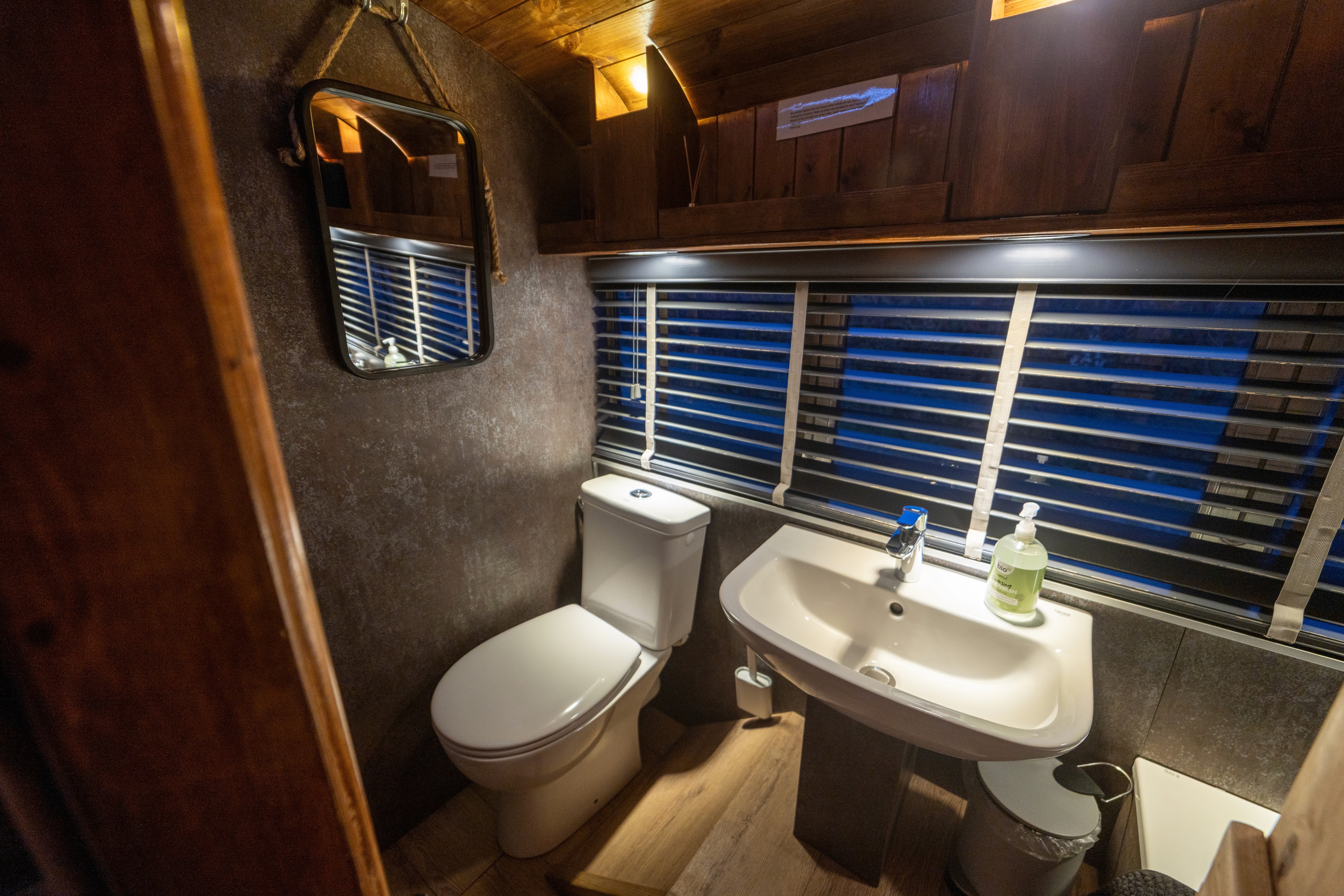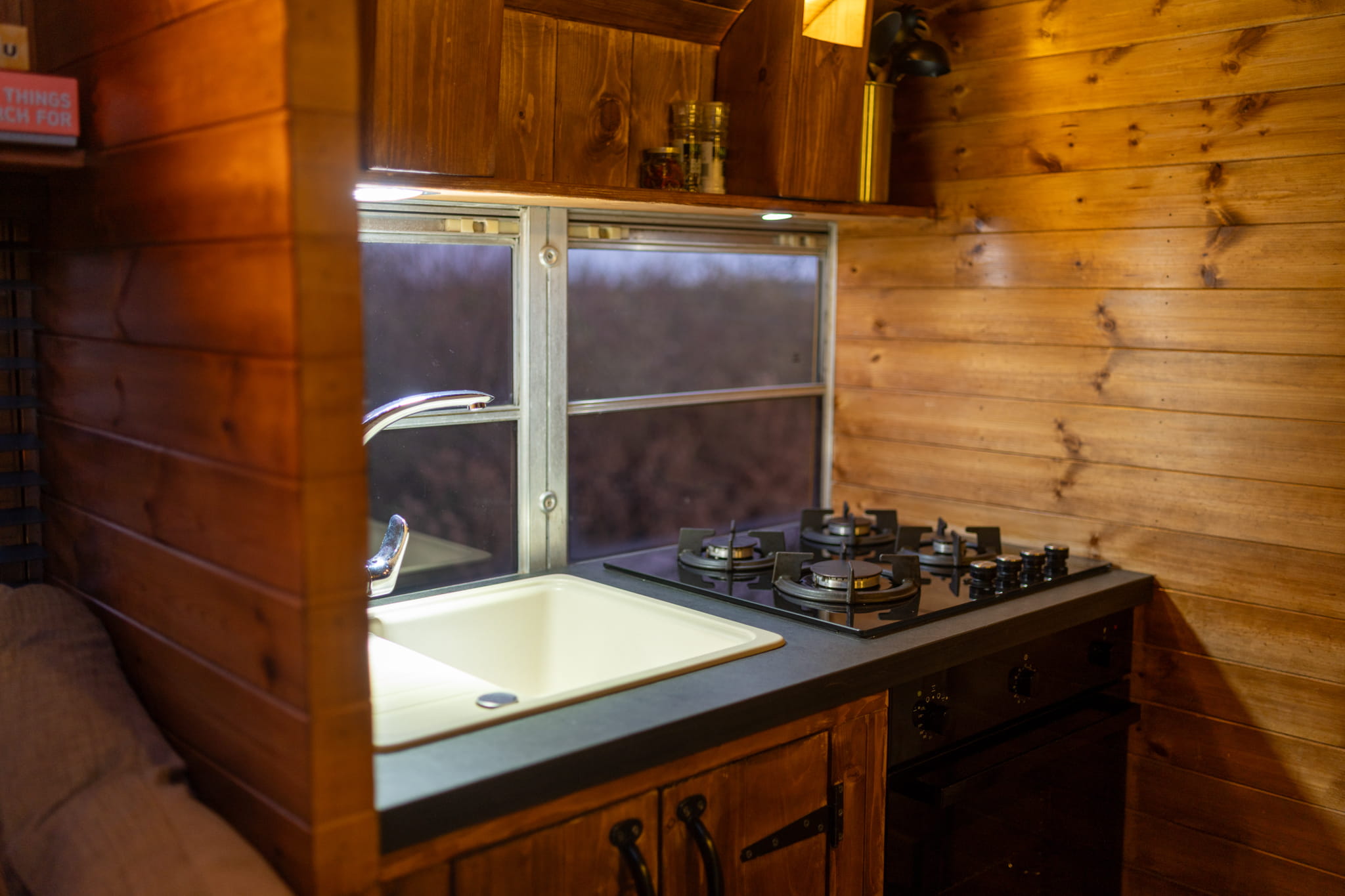 Inside, the compact kitchen comes equipped with an oven, hob, and microwave, offering all the essentials for relaxed self-catering. Beyond this, the living area provides comfortable built-in seating and a cosy dining nook, with a log burner adding warmth and atmosphere for restful evenings. A bathroom with a small tub and shower provides convenient everyday comfort, complemented by a hot outdoor shower for a refreshing rinse in the open air. Toward the back of the bus, the space transforms into a snug sleeping retreat, where little ones can tuck into their cleverly designed bunk beds before you slip into the inviting king-size bedroom beyond — a peaceful hideaway framed by the gentle curve of the bus and the quiet countryside outside.