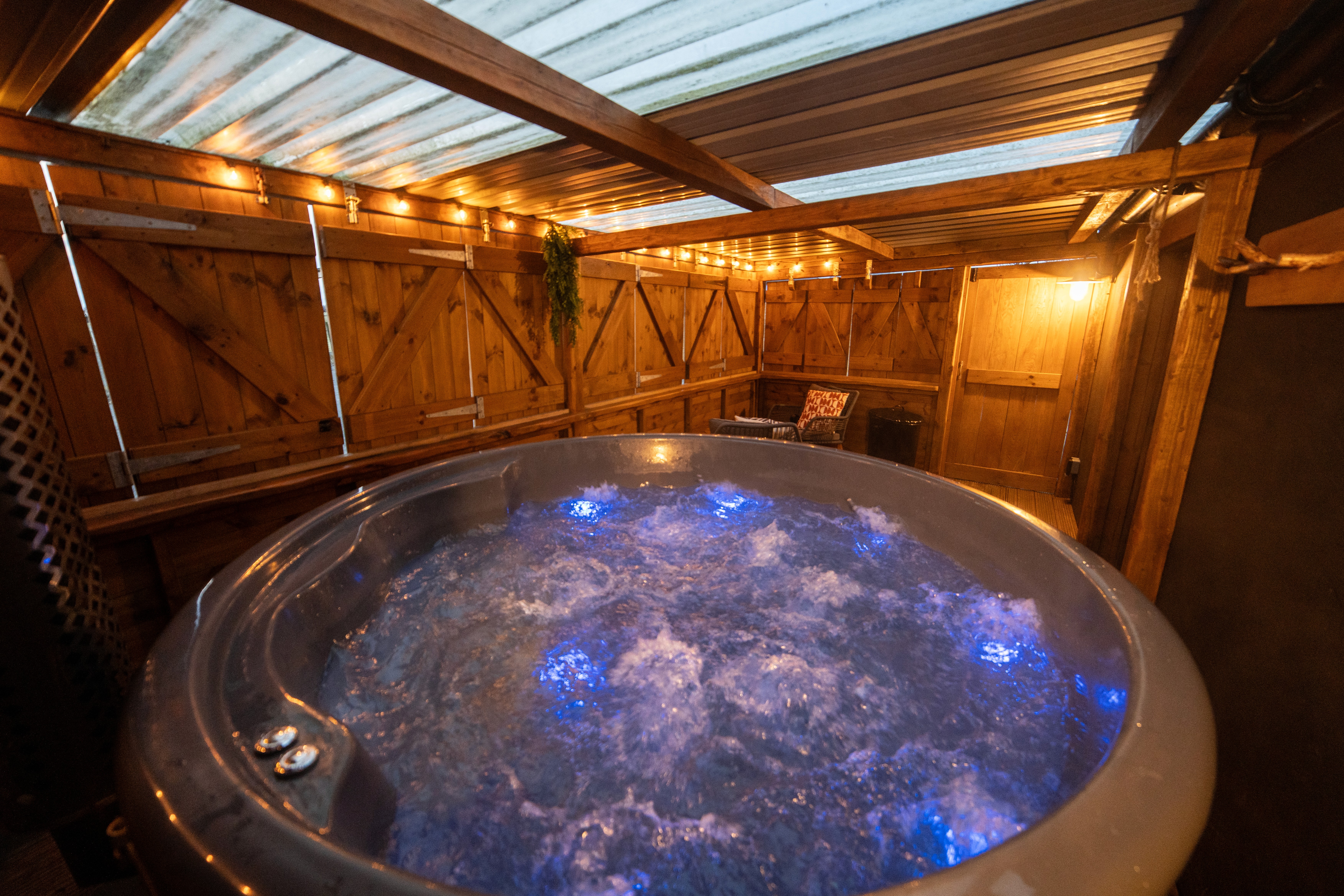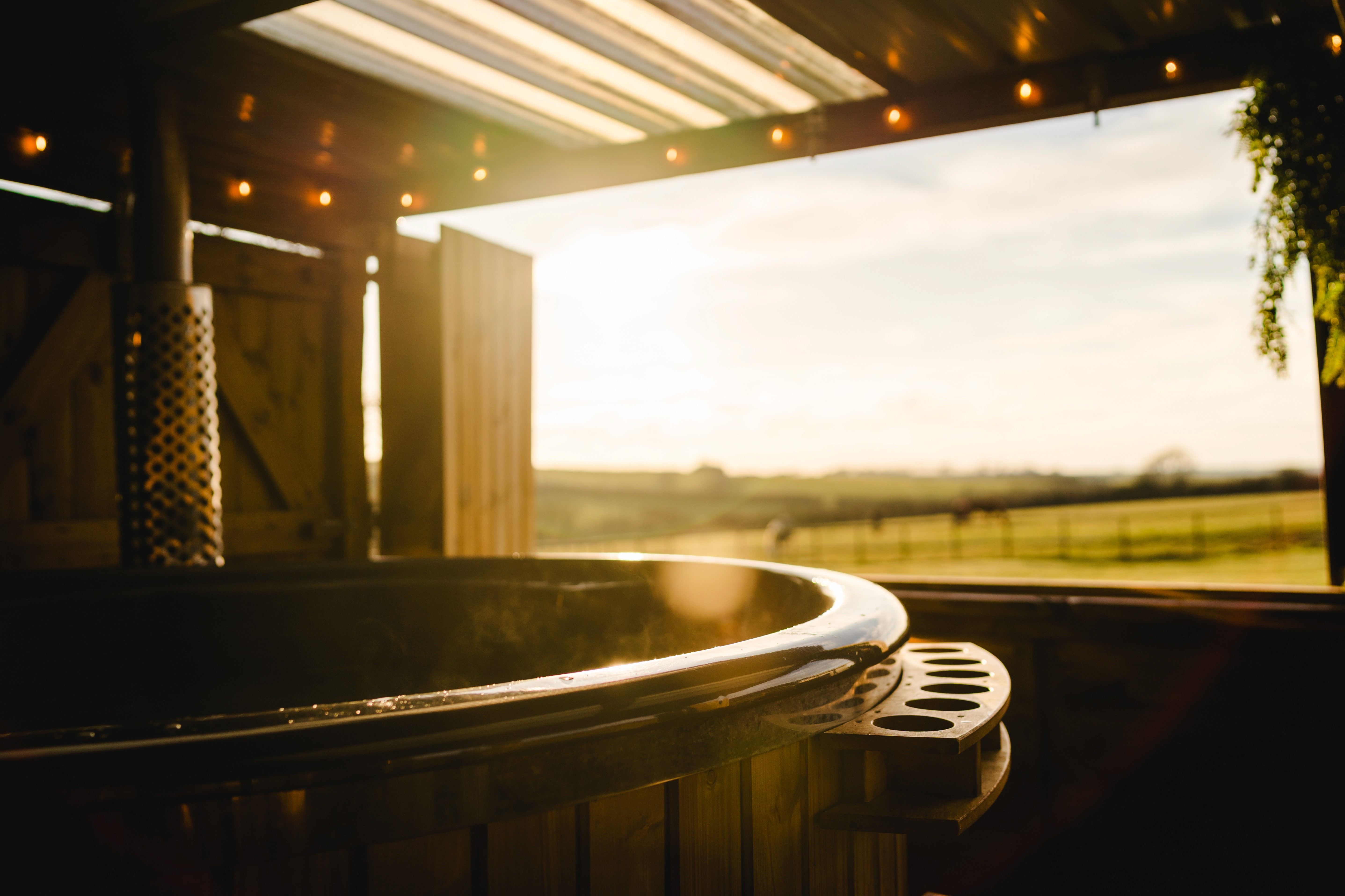 Step outside to the enclosed private decking, complete with wooden shutters for privacy or shelter. Sink into the wood-fired hot tub as the sky fades to dusk, or keep the shutters closed for a cosy soak in any weather. The surrounding fields and evening sunsets create the perfect backdrop for slowing down and enjoying the moment.