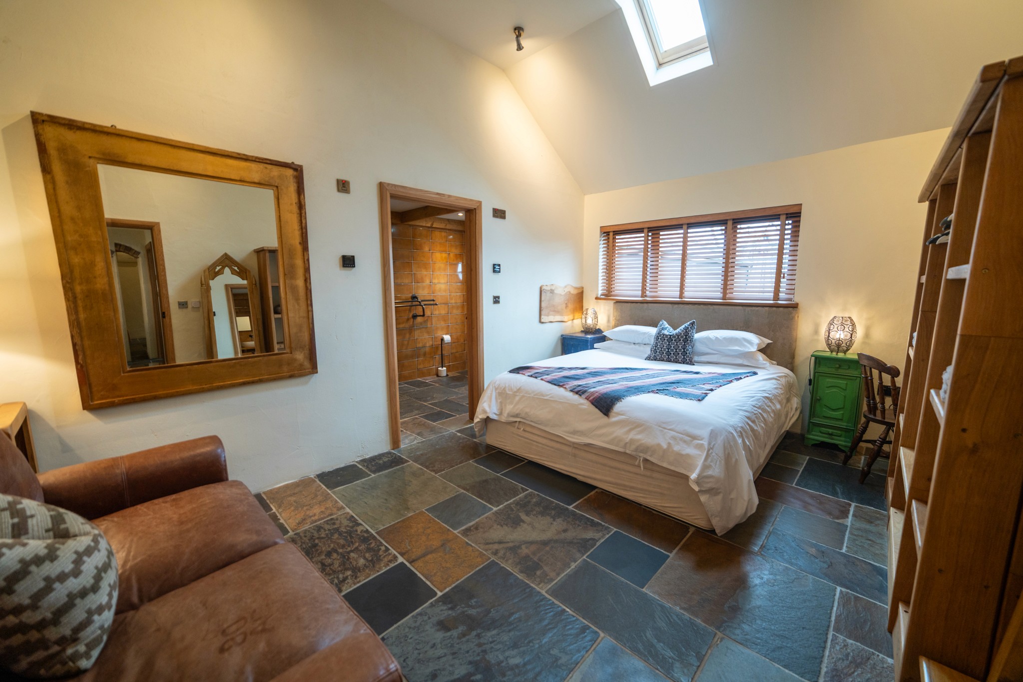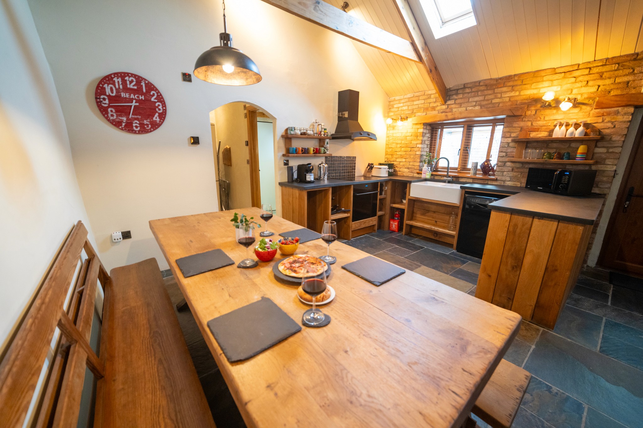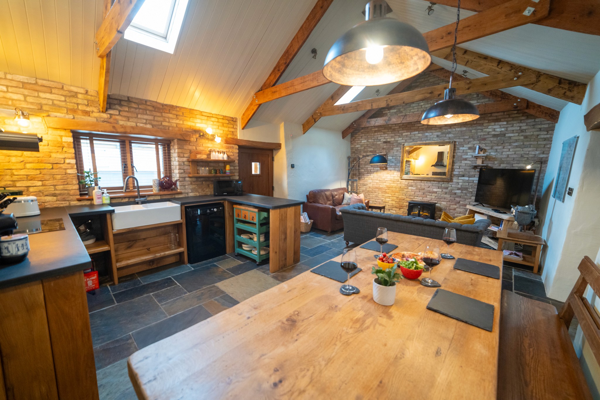 • Open-Plan Living Area: The barn conversion features an inviting open-plan lounge, kitchen, and dining area adorned with oak beams and a slate floor, creating a warm and spacious atmosphere.