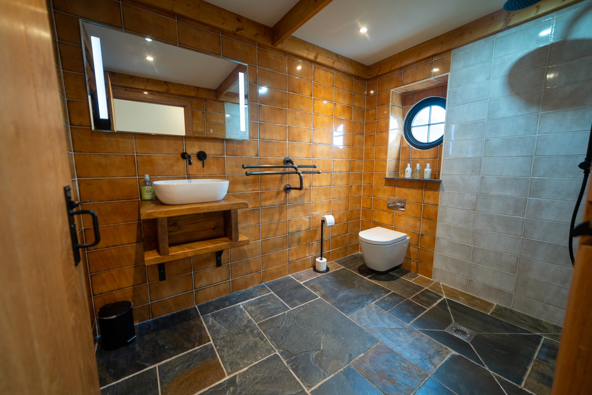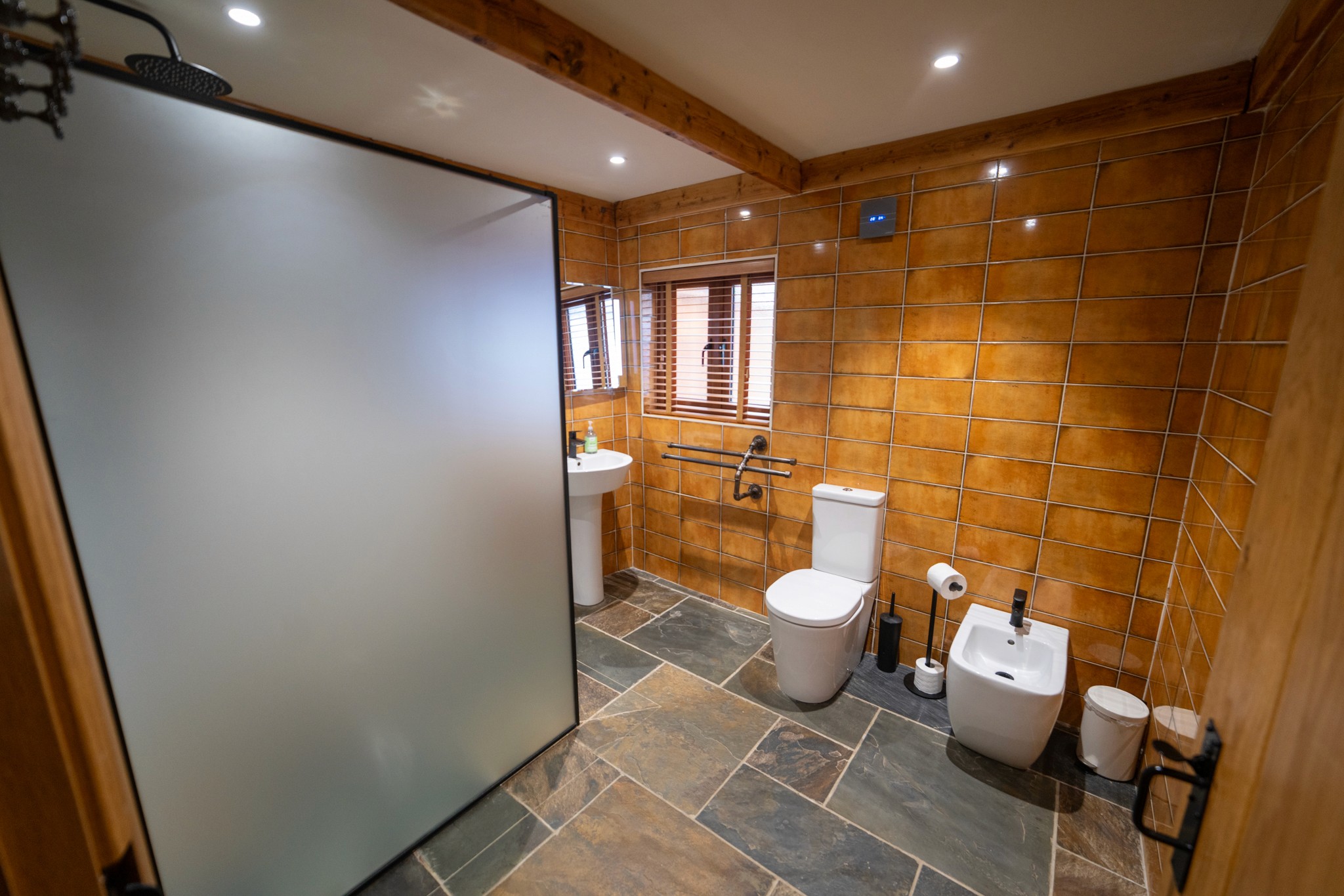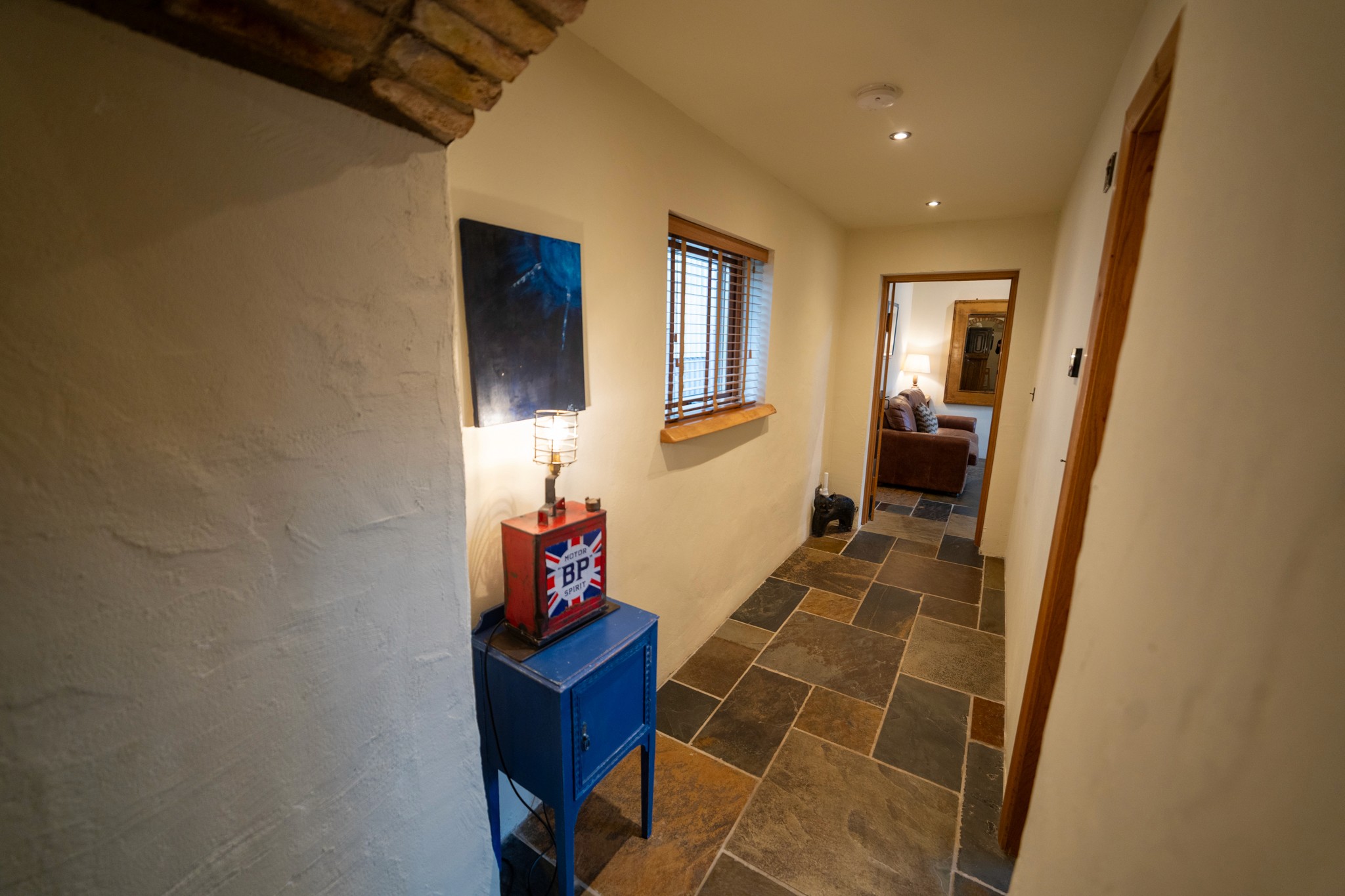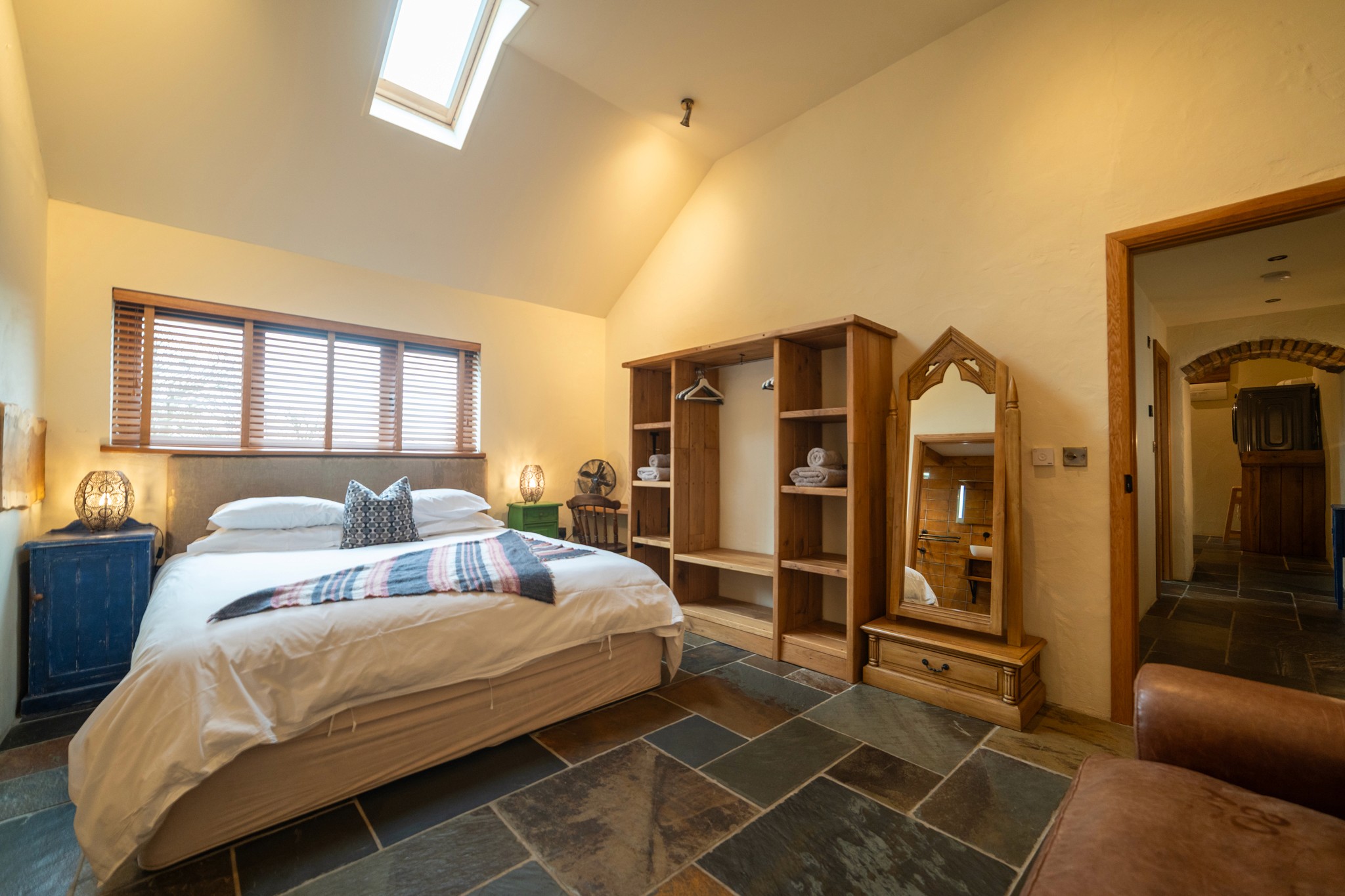 • Open-Plan Living Area: The barn conversion features an inviting open-plan lounge, kitchen, and dining area adorned with oak beams and a slate floor, creating a warm and spacious atmosphere.