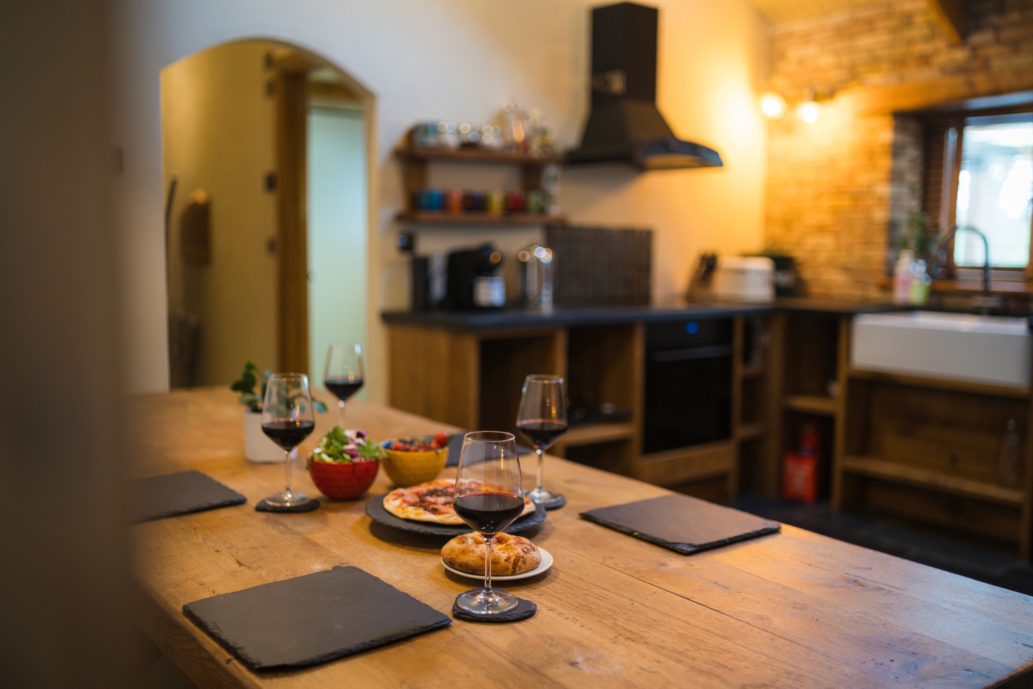 Inside, you’ll find an open-plan living, dining, and kitchen space with exposed beams, a striking brick feature wall, and a grand oak dining table — ideal for gathering after a day exploring the coast. The cottage features underfloor heating throughout, creating a warm and cosy atmosphere in every season. The well-equipped kitchen includes an oven, hob, and Nespresso coffee machine, providing everything you need for relaxed meals and slow morning coffees.